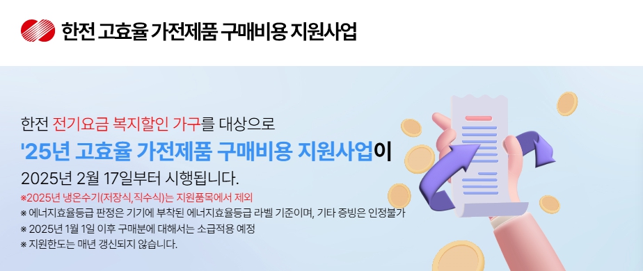 '한전 고효율 가전제품 구매비용 지원사업' 이 정식 명칭으로 사용되며 이 사업은 한전 전기요금 복지할인가구를 대상으로 에너지복지 확대를 위해 고효율 가전제품 구입 시 구매비용의 일정비율(가구당 30만 원 한도)을 지원해 주는 사업을 말합니다. 쉽게 말해 전기 효율이 좋은 제품을 구입하면 일정 금액을 돌려주는 정부 지원 정책으로 이해하시면 됩니다.